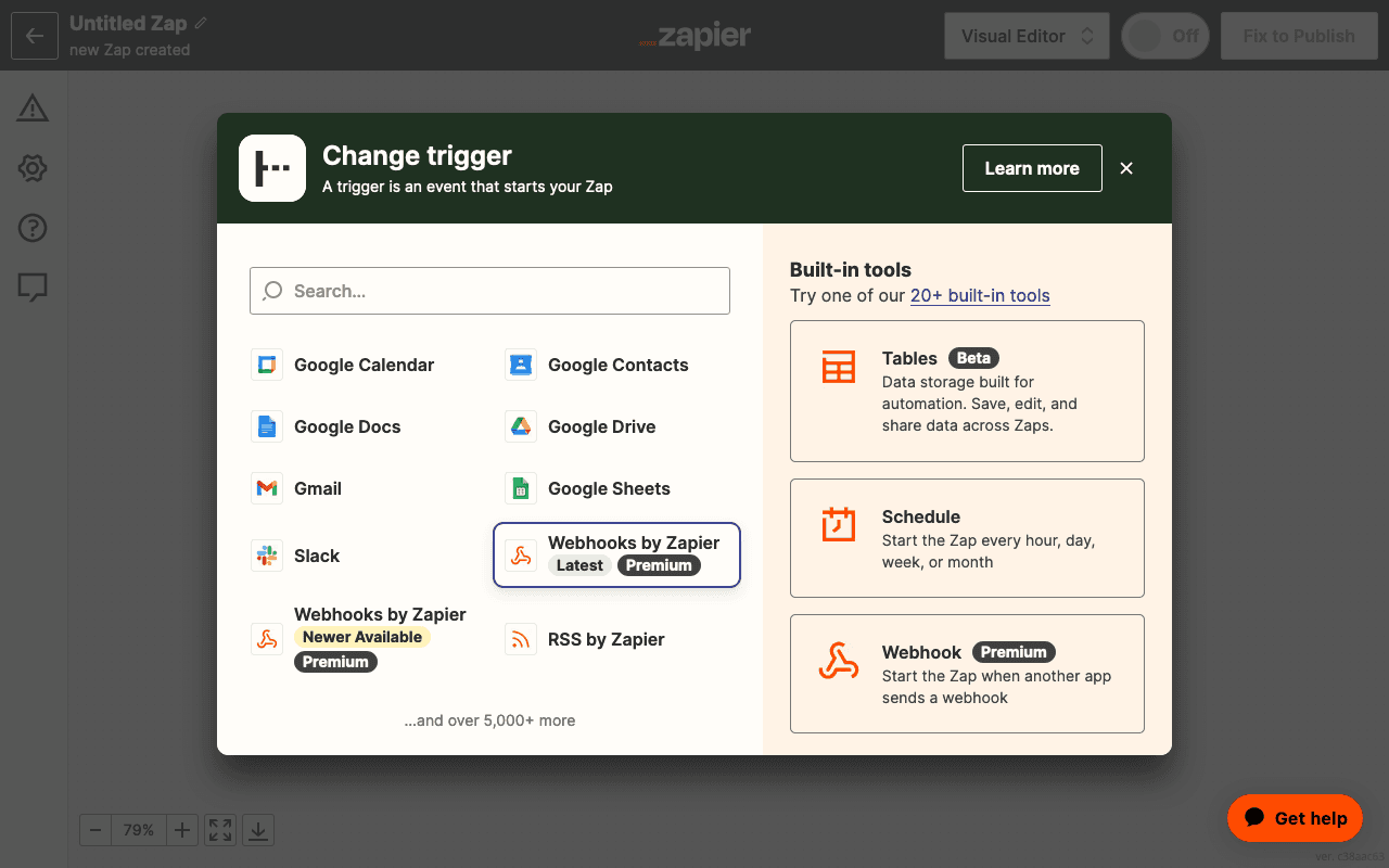 Click the Trigger button to add the Webooks by Zapier trigger. Use the search bar if the trigger is not visible. Then select the Catch Hook event type.